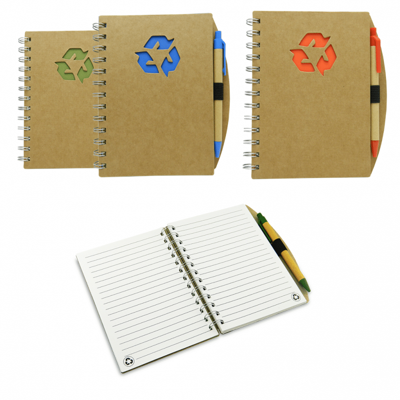 Elaborada con cartón reciclado, argollada, incluye esfero Ecológico, 17.9 cms x 14.8 cms, Impresión Tampografía Tinta Plástica o Impresión en Screen a una tinta