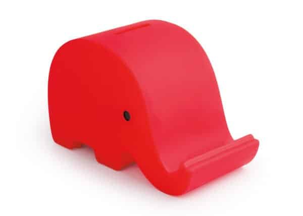 Alcancía con diseño de elefante. Su trompa sirve como holder para celular. Con tapón en la parte inferior para vaciar la alcancía. MATERIAL: PVC, MEDIDAS: 13,8 x 8,5 x 6,7 cm, ÁREA DE IMPRESIÓN APROXIMADA: 4,5 x 3,6 cm.