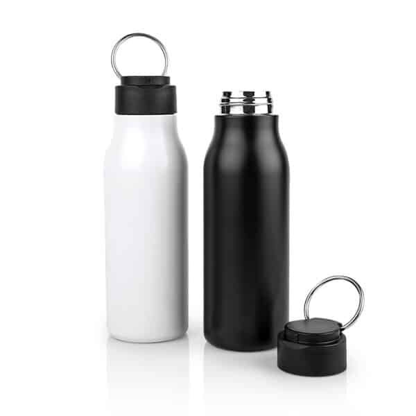Botella en acero inoxidable de 600 ml / 20 Oz, tapa rosca con gancho para transportar fácilmente. MATERIAL: Acero Inoxidable MEDIDAS: 6,9 Cm de diametro x 21,1 cm