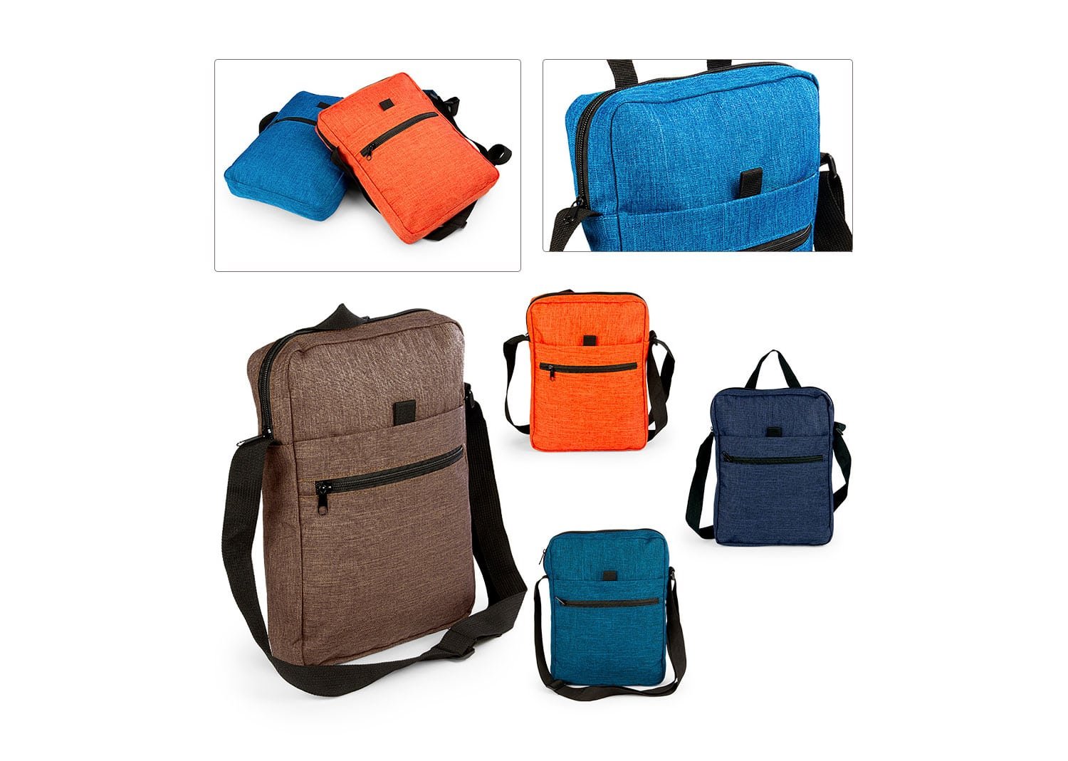 Manos libres con cargadera ajustable y agarradera. Bolsillo principal y frontal en cremallera, bolsillo medio con cierre en velcro. MEDIDAS: 23 x 32 x 5 cm. Longitud correa: 120 cm. Manija: 16 cm. logo a una tinta.