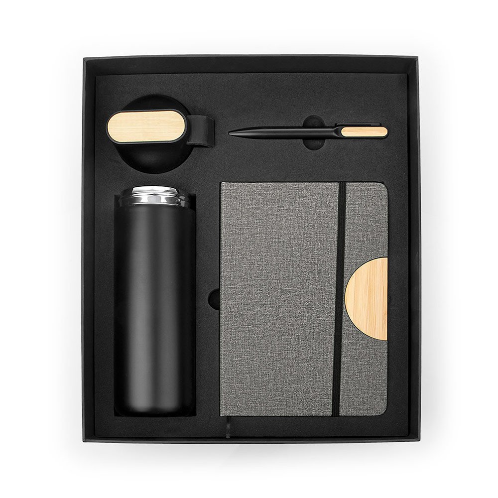 Set ejecutivo con estuche de lujo. Incluye bolígrafo en aluminio con sistema twist, Libreta con 80 hojas rayadas, banda elástica de cierre lateral, cinta marcadora y porta bolígrafo. Mugde 600 ml / 20 Oz en acero inoxidable con tapa rosca y banda de silicona para transportar con facilidad. los 3 elementos tienen un detalle en Bambú para marcar en laser. Logo en screen, laser y tampografía